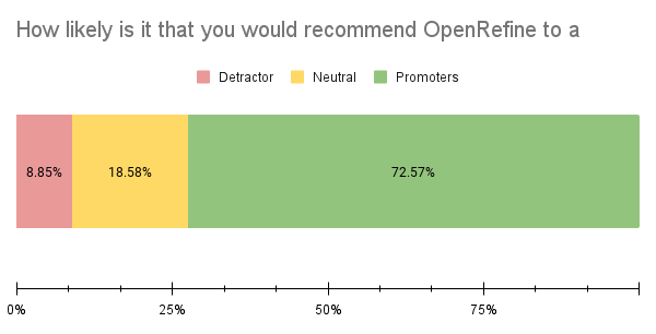 This year, instead of requesting a numerical score, we calculated a Net Promoter Score (NPS), which ranges from -100 to +100. OpenRefine achieved a total score of 63.72. Among respondents, 72.57% were promoters (those who scored nine or ten) and would recommend OpenRefine, while only 8.85% were detractors (those who scored six or below).