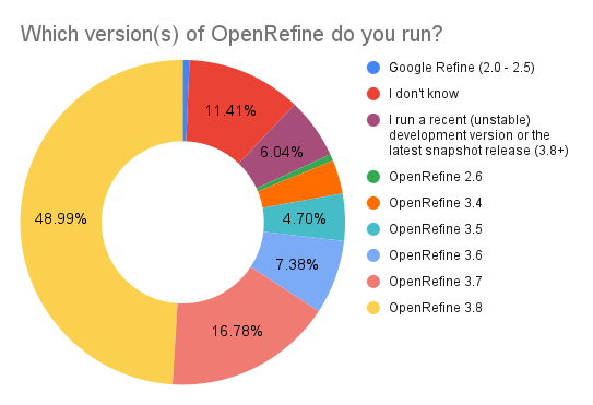 Close to 49% of respondents currently run OpenRefine 3.8, the current stable release, while 6.04% use a development version. Additionally, 22.12% of users run an older version, consistent with the 23.8% of users running a legacy version in 2022.