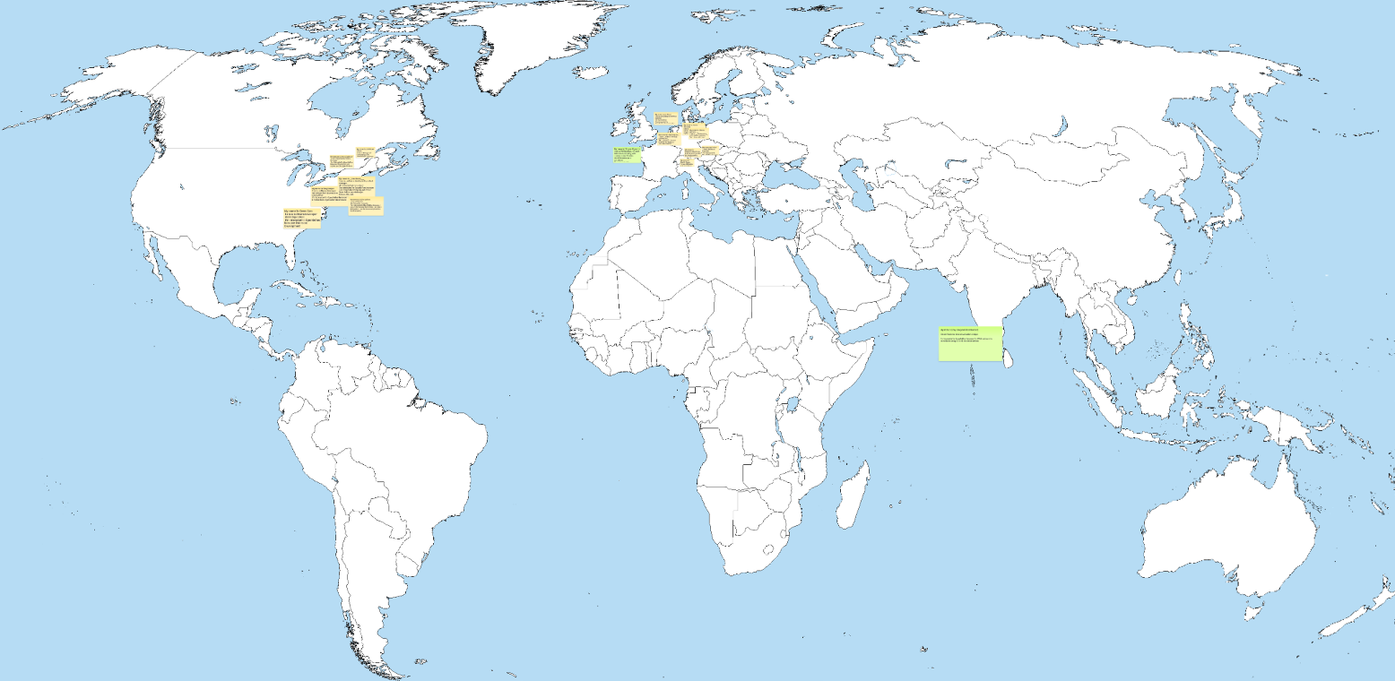 The map below was created during the BarCamp as part of a shared exercise and reflects where participants were joining from.